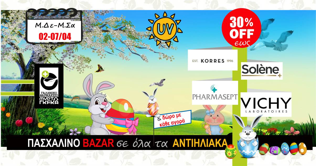 Πασχαλινό bazaar αντηλιακών με μεγάλες εκπτώσεις και δώρα - Ανοιξιάτικη Διάθεση !!! Όλη τη Μεγάλη Εβδομάδα όλα τα αντηλιακά Korres, Solene, Pharmacept, Vichy, Luxurious και άλλων εταιριών θα τα βρείτε στο Φαρμακειο μας έως 30% και δώρα με κάθε αγορά...