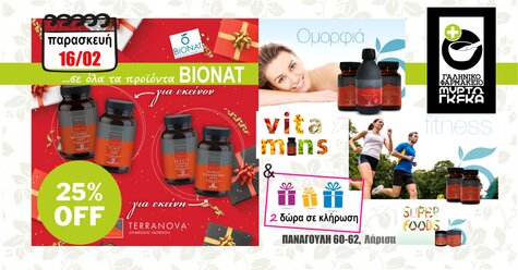 Μόνο για την Παρασκευή 16 Φεβρουαρίου και για όλη την ημέρα στο φαρμακείο μας θα είναι σε προσφορά όλα τα προϊόντα της BIONAT με έκπτωση 25% !